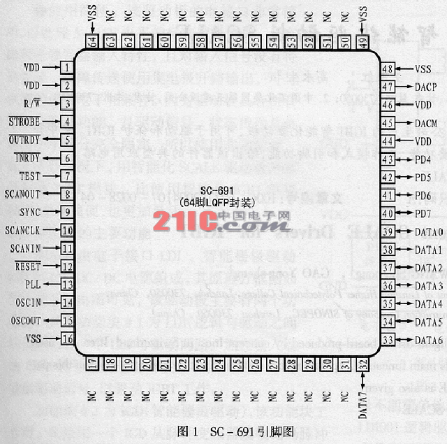 SC-691具有36脚裸片和64脚LQFP两种封装形式。图1是其LQFP封装的引脚排列图,各引脚的功能说明如表1所列。图2是其内部结构框图。