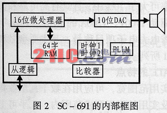 SC-691型语音和音乐合成芯片的电源电压(VDD)范围为3~5.2V,它的CPU时钟 fCPU 范围为64~12320kHz,其DACP和DACM间的负荷电阻RDAC 最小应大于32Ω。